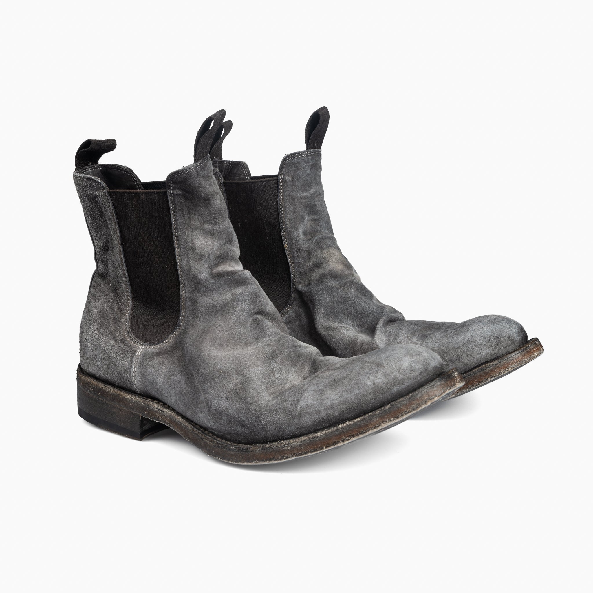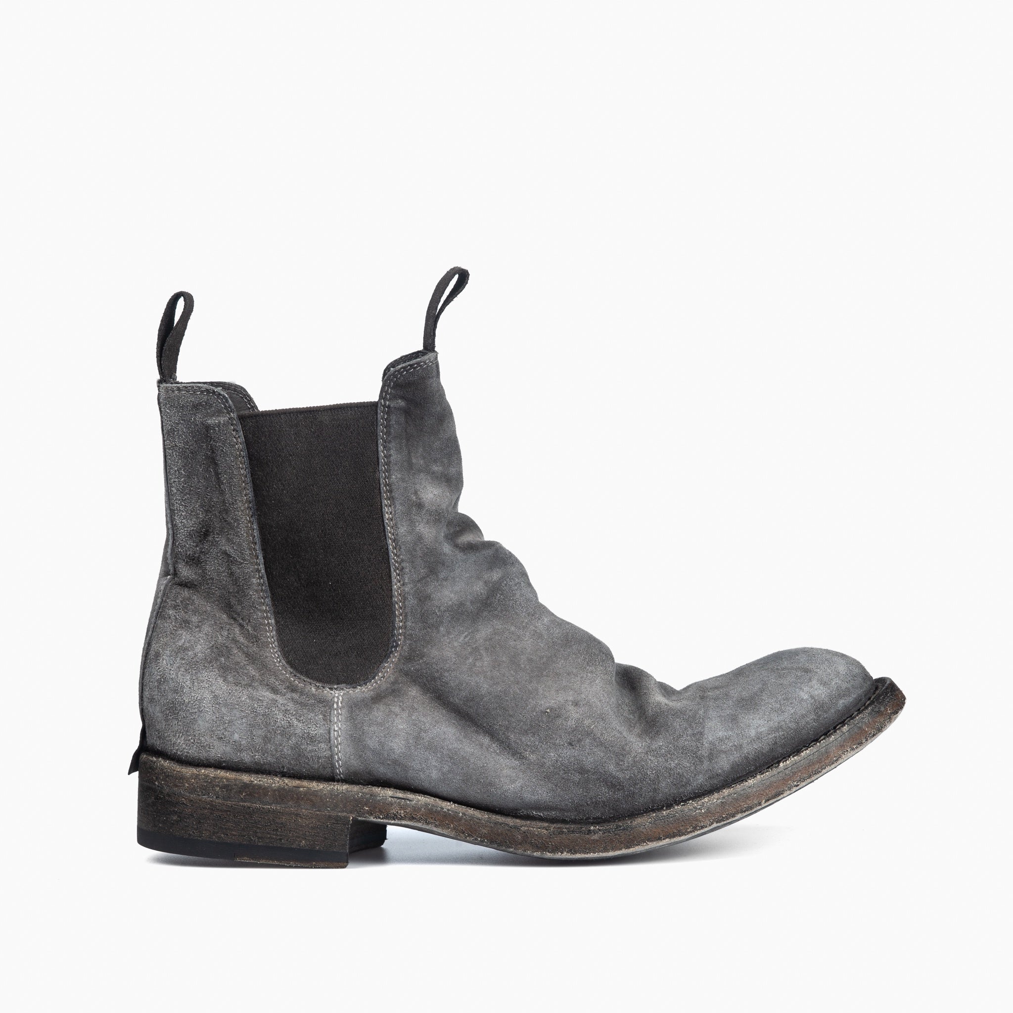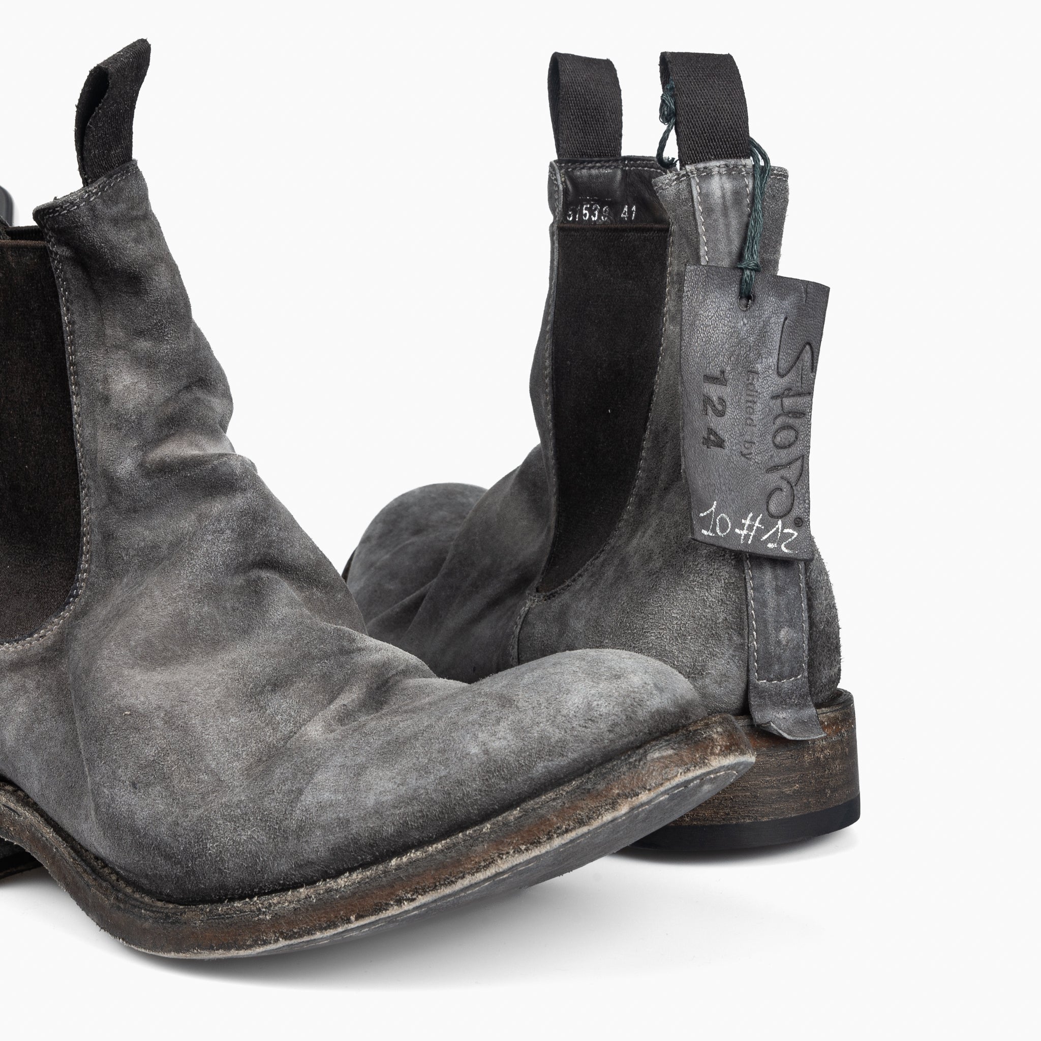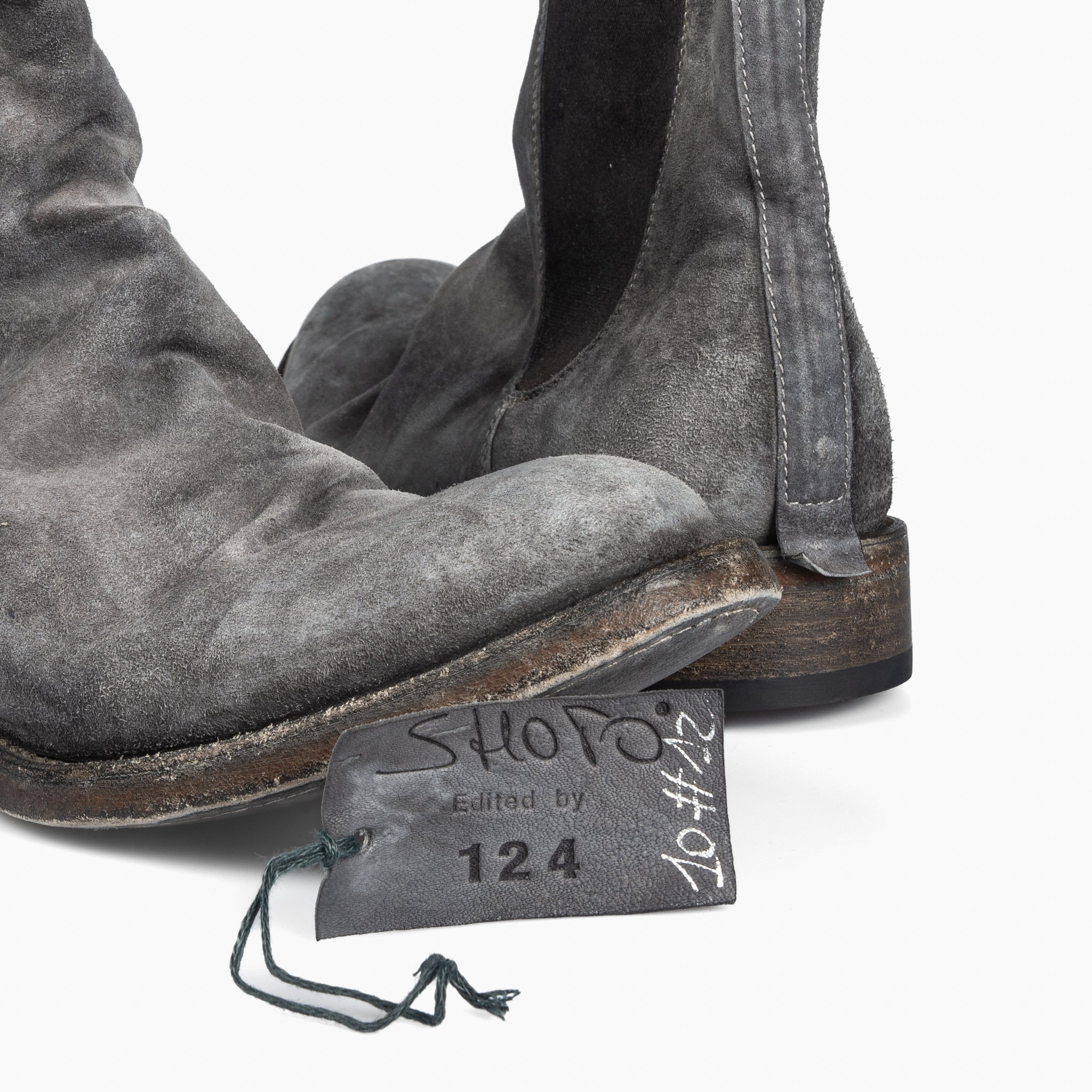 Limited edition Chelsea boot from Shoto Edited by 124.These boots feature a contrasting object dyed hand finish. A special treatment, using hot wax and iron, gives the shoes a burnished look. The shoes are then washed and left to dry naturally. They are finished with a Blake Rapid construction under the sole and the insole, making them more resistant and very comfortable.