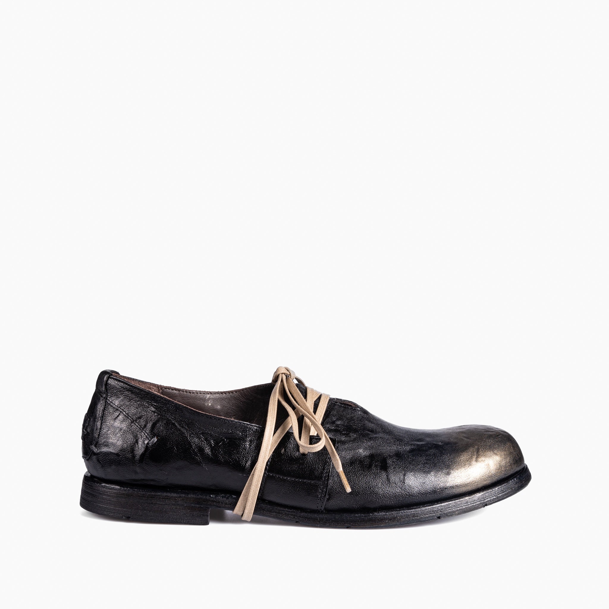 Women's handcrafted lace-up derby from Le Ruemarcel, featuring an asymmetric teo and an aged washed napa leather with gold toe finish. A flexible leather sole with sachetto construction makes these extremely comfortable. A trans-seasonal staple shoe for any women's wardrobe.